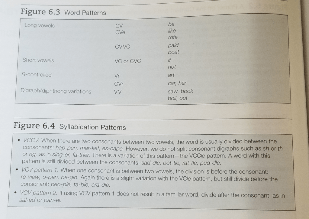 Man this chapter had a ton of great information on ways to assist children in learning to read words. I’ve seen my son bring home flip books a lot this year. I didn’t have any clue what they were until I read this chapter! I really like the idea of Making words with students. I think after we read a book, it would be a great lesson to make words that were in the book so that students can make better sense of them. Especially in the K-1st Grade range. I thought it was interesting when I read that one of the first words children recognize is ball because of the tall peaks in the b and ll. I love writing poetry so I think it would be fun to have students who are in the 3rd grade range write a small poem using onsets and rimes.