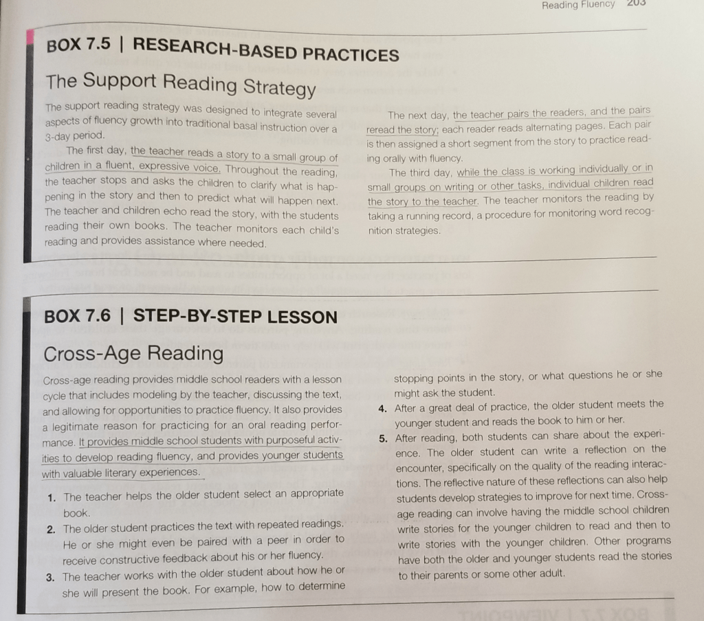 Classroom Application: I could see using all of these methods in my classroom at one time or another, but I really like the idea of using peer tutoring. I think its great for one student who is above level to work with another student who is below level. Children learn so much from one another and they know how to describe things in ways that adults can’t. I really think one day a week in my classroom during reading time I would cut out a 15-20 minute block for paired student reading. I will already have my pairs made ahead of time and I will select a title appropriate for the reading. But I feel like if my student’s get used to doing that weekly they will know its coming and be prepared for it.