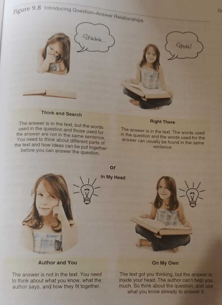 Question-answer relationships (QARs) help learners know what information sources are available for seeking answers to different types of text questions. As a result, teachers and students become cognizant of the three-way relationships that exist among the question, the text to which it refers, and the background knowledge and information at the reader’s disposal. QAR’s enhance children’s ability to answer comprehension questions by teaching them how to find information they need to answer questions.