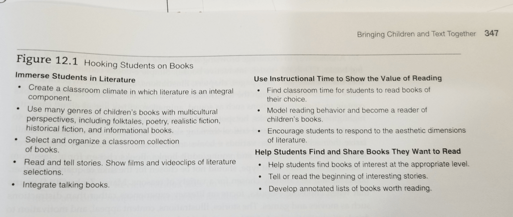 Helping Students select books– Teachers can find ways to get students excited about books by telling exciting anecdotes about authors, providing previews of interesting stories, showing videos about stories, suggesting titles of stories that match students’ interests, encouraging author searches on the Internet, sharing leveled book listings, or compiling teacher-or-student-annotated books lists.